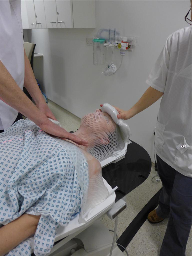 Within the 'moulding' room, you are asked to strip from the waist up and put on a gown. You then lie on a special table and a sheet of warm plastic mesh is placed over your head, neck and shoulders. This is full of little holes so that you can breath and has been softened in a bath of hot water. The best way to describe this experience is if you imagine a warm, wet towel being laid over your upper body. It then gently stretches and conforms to your profile and is fixed to the table you are lying on with special clamps around the perimeter. The mask is pressed down around the contours of your body for a snug fit and ice packs are applied to the mask to cool and therefore set it into shape. This is very snug and holds you perfectly still.